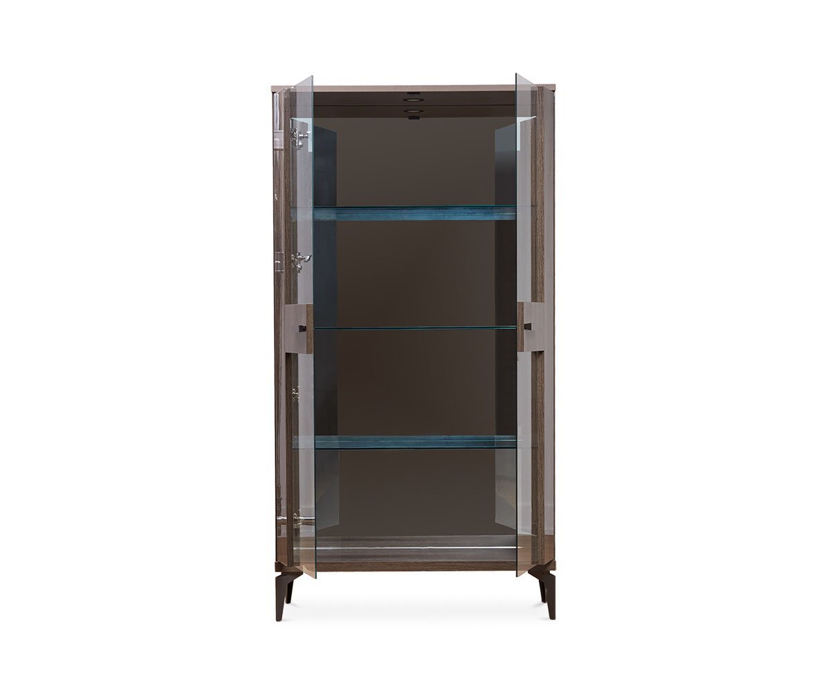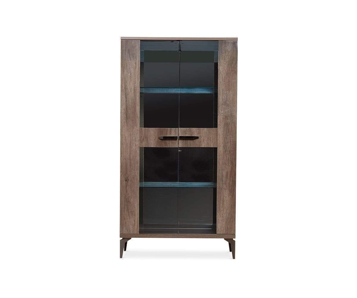 Made in Italy, the Akana curio cabinet stands handsomely in your living space. A perfect display and storage piece for your dining room, natural warmth is achieved from the striking wood grain pattern enhanced by the high gloss finish and intriguing metal accents. Installed LED lighting allows all of your treasured objects to be admired behind two tempered glass doors and adjustable shelves. Add sleek, modern style to your space with the addition of the Akana curio.