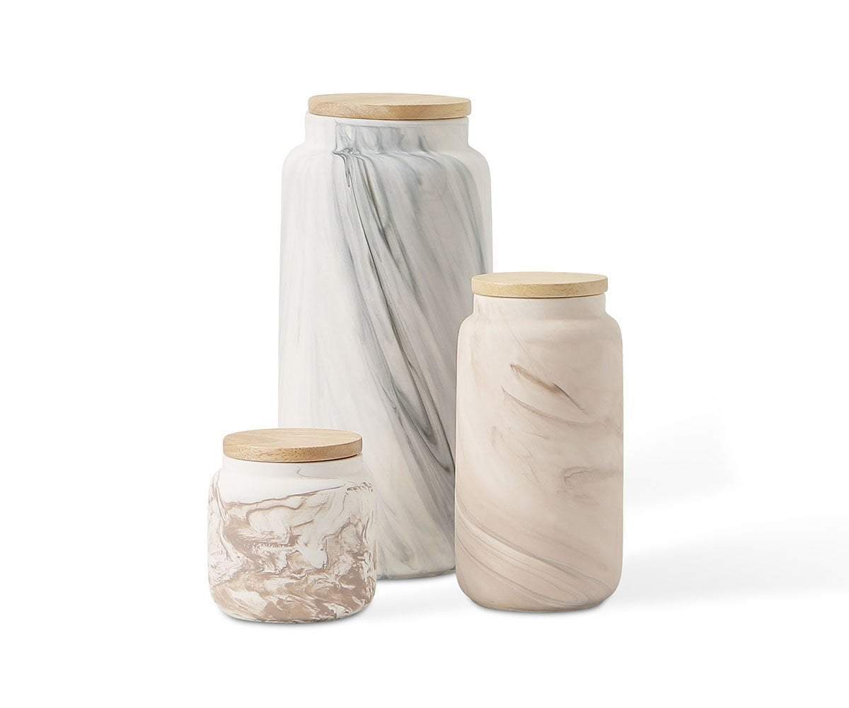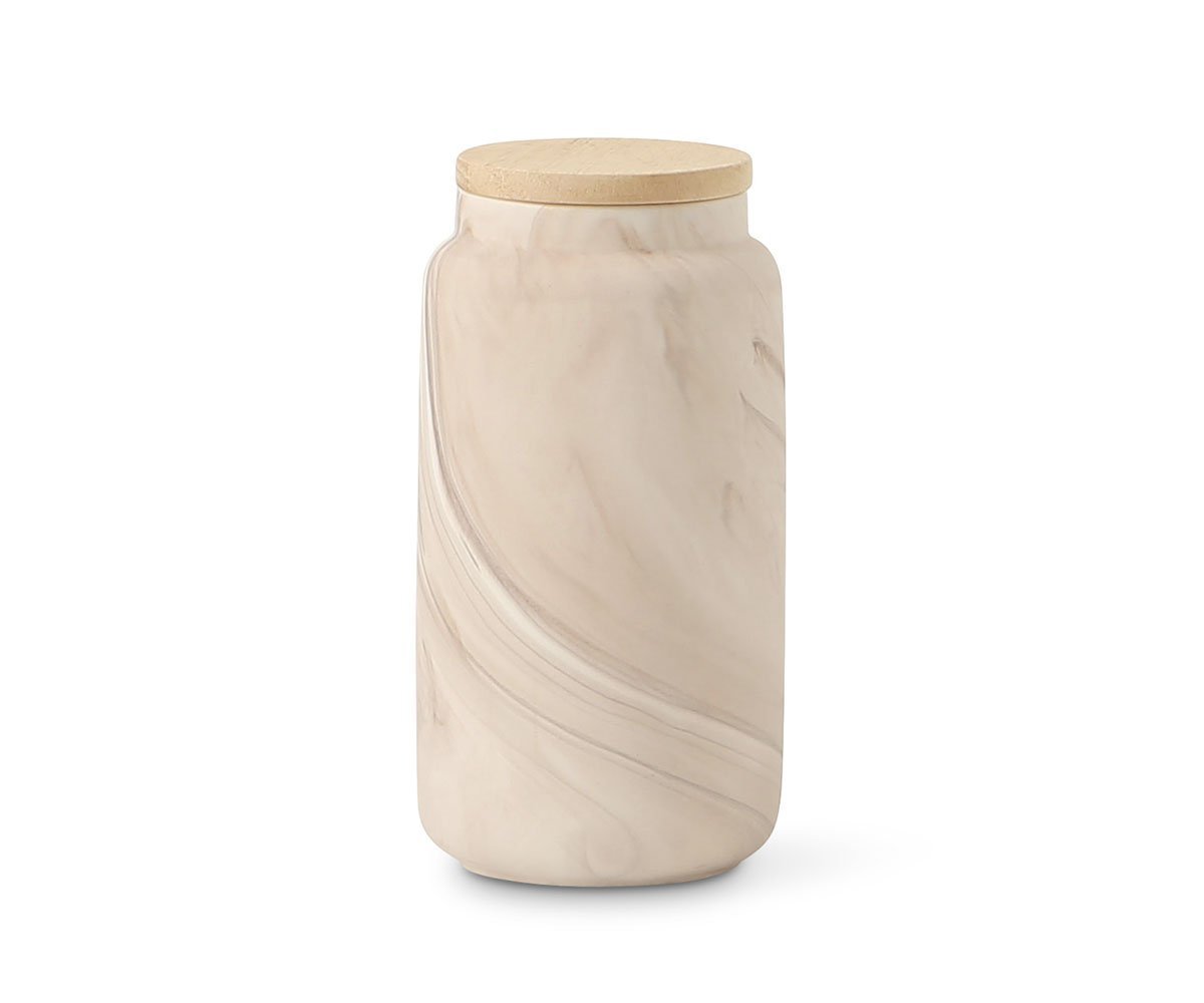 The Akran ceramic jar is smooth to the touch and displays a beautifully marbled design. This accessory is functional as well as decorative by providing a stylish spot of storage where you need it. Its lid made of oak gives a natural touch that enhances the overall look.
