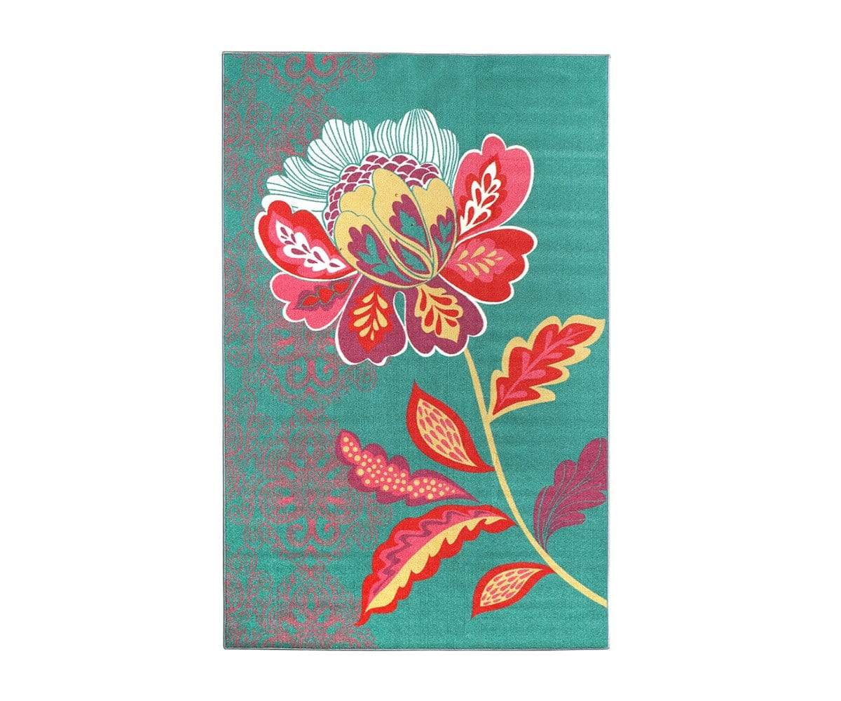 The Amaranda rug brings a splash of color to any room. With a bright teal background, the large multicolor flower graphic pops. Made from 100% nylon for easy cleaning and durability.