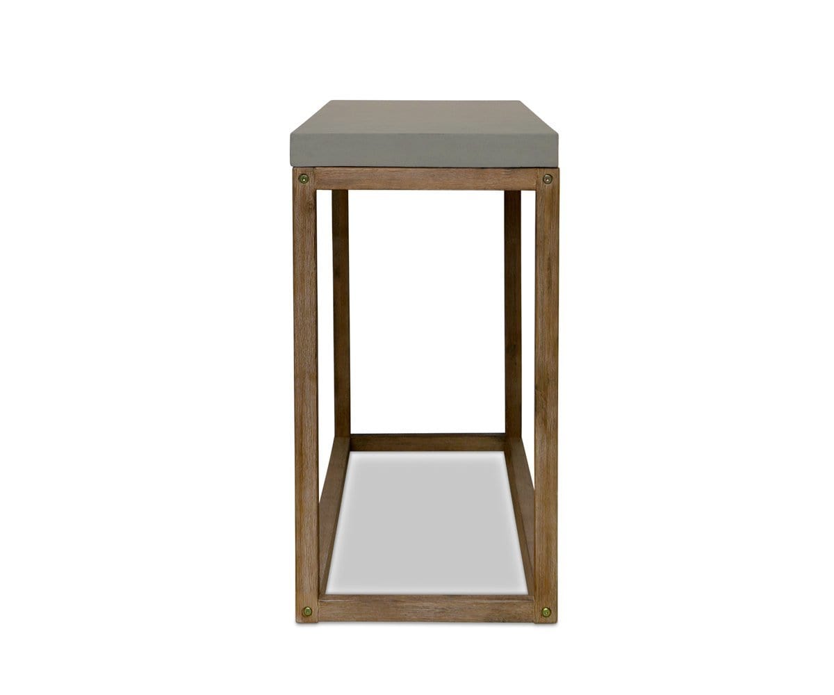 Your go-to solution for indoor or outdoor use? The Armon console table. The base is solid acacia, renowned for its distinctive, swirling grain. The tabletop is crafted with ultra durable material in a natural cement finish for a look that's both modern and timeless.