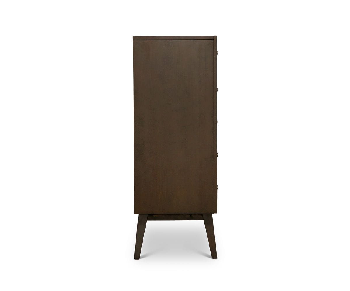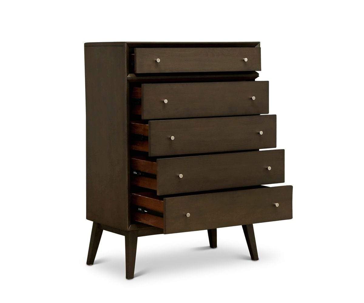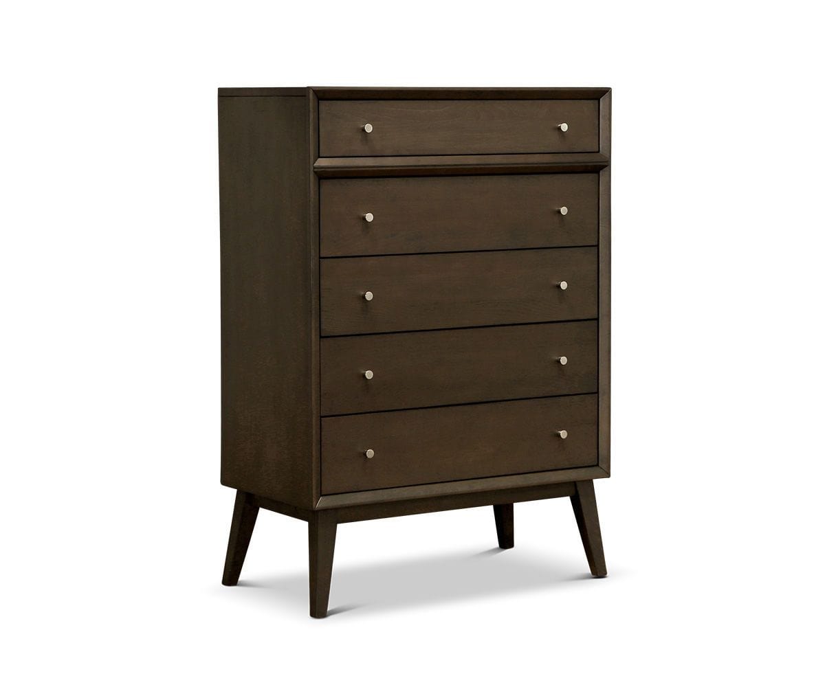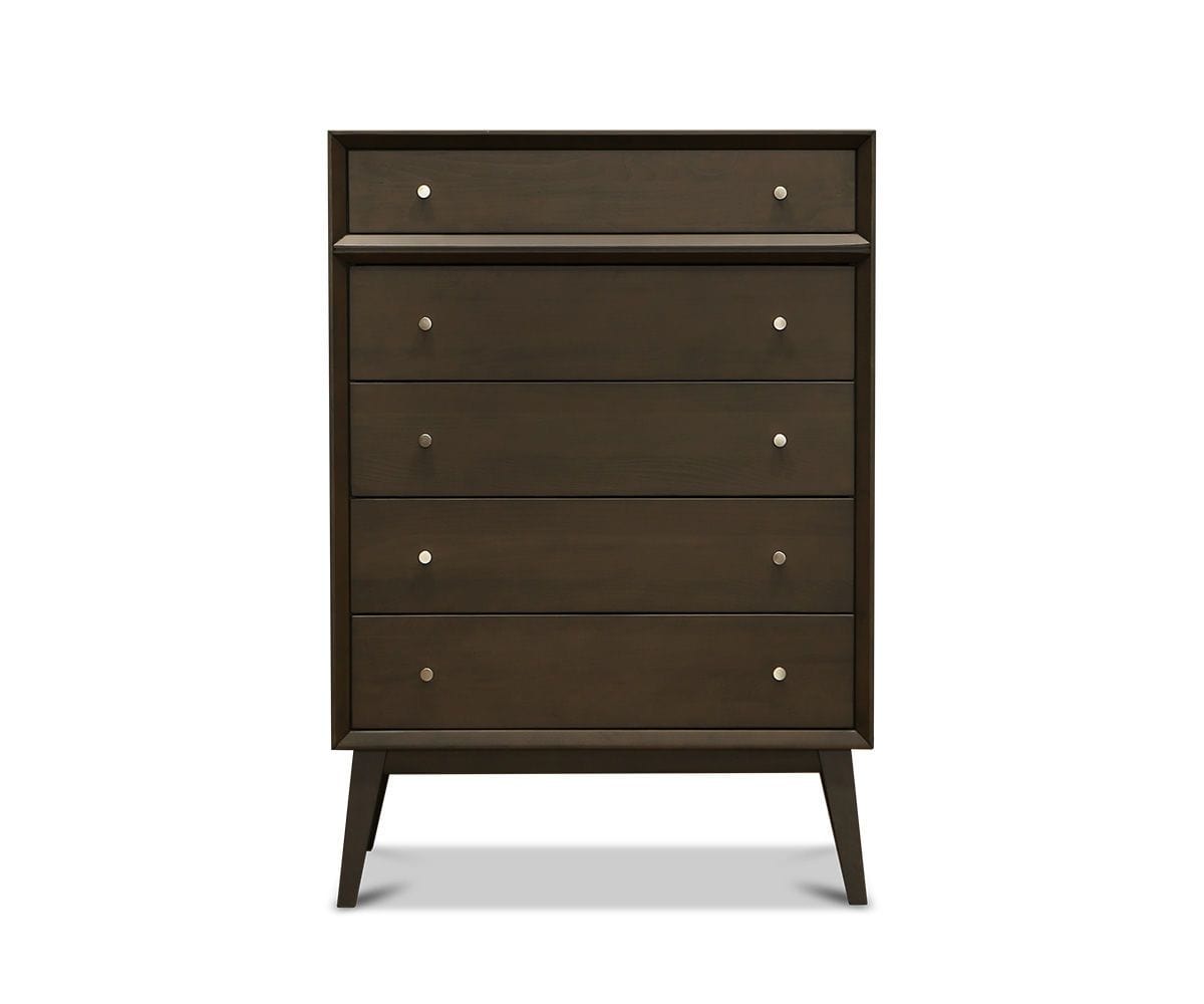 Refreshing your bedroom begins with refreshing your storage pieces. Crafted from solid beech, the Bennett high chest's smoky color has a bold, modern tone. Five drawers of varying depth give you a wealth of storage options.