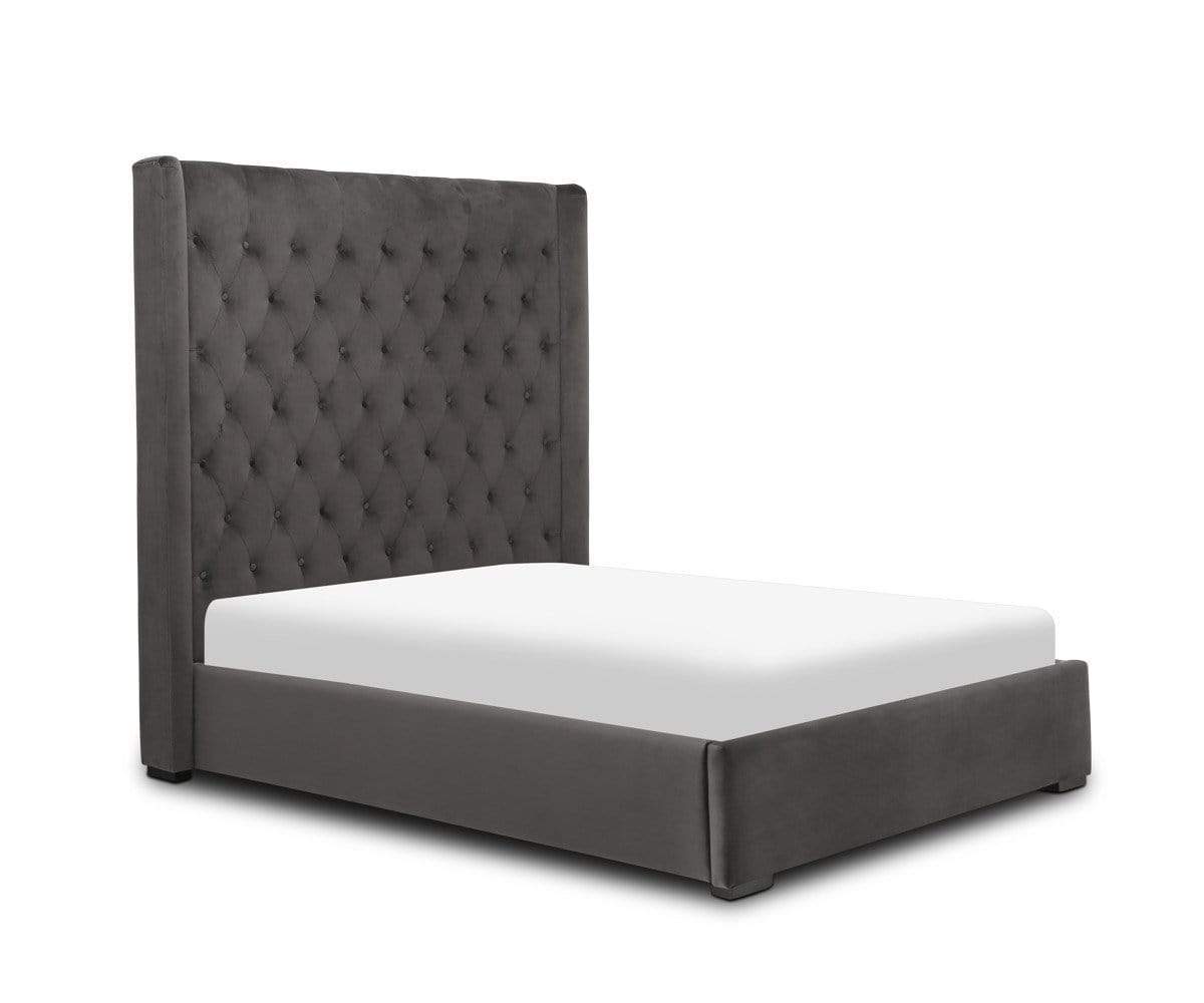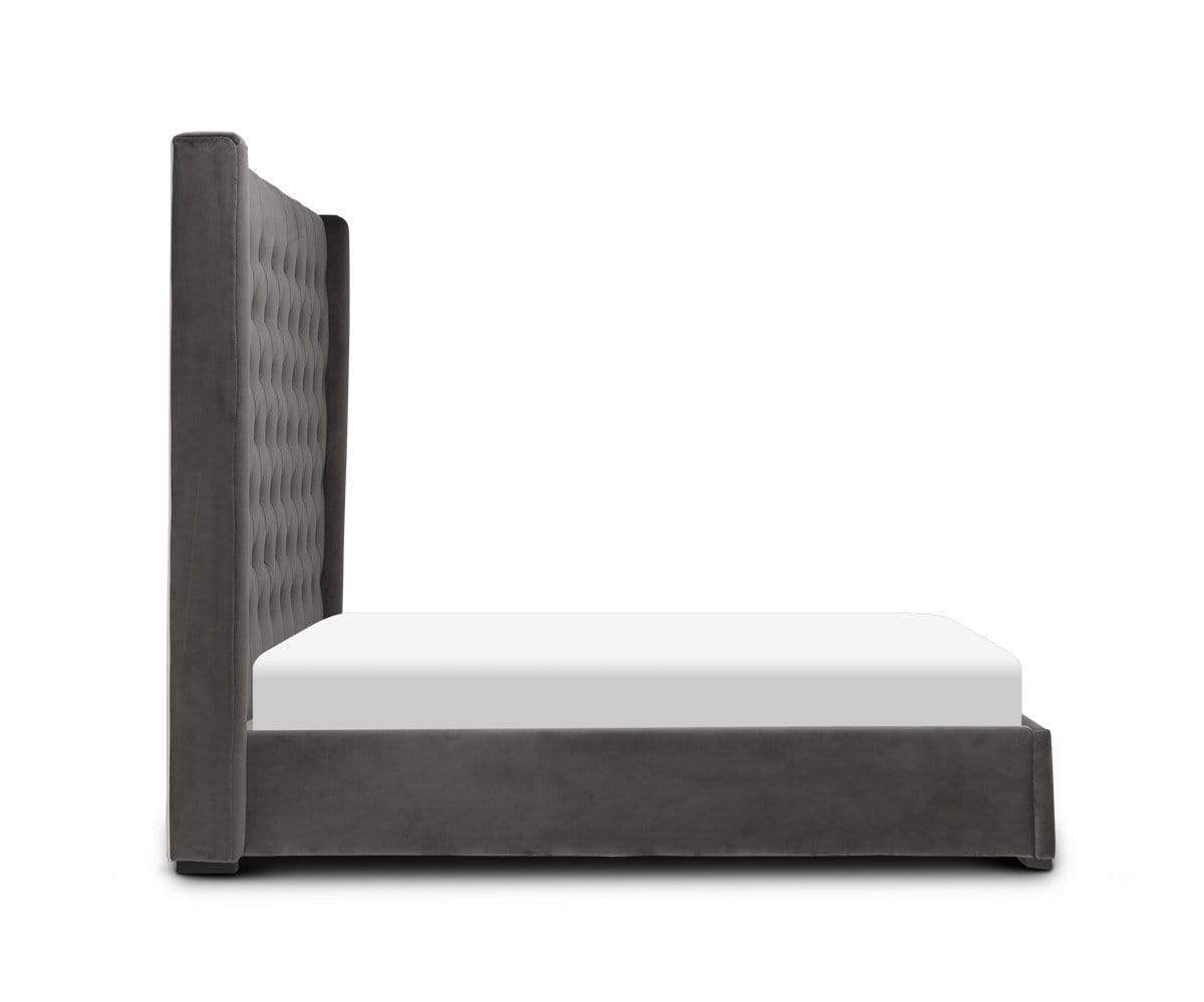 The contemporary centerpiece of your bedroom has arrived. The Bidwell upholstered bed makes a statement from the start, with an extra-tall headboard, clean lines and tailored profile. The dark grey velvet upholstery adds a dramatic flourish, accentuated beautifully by delicate, button-tufted details.
