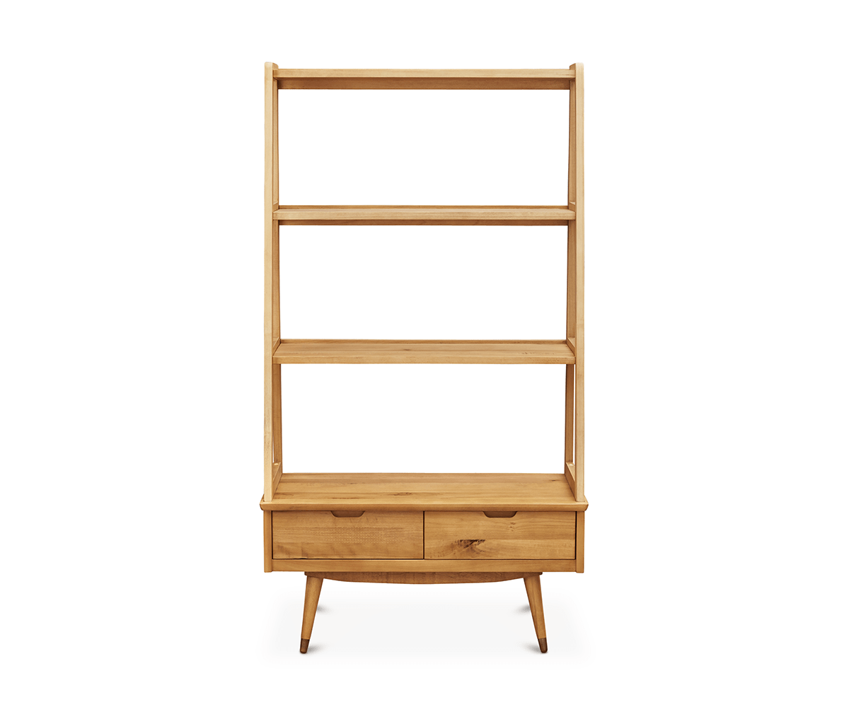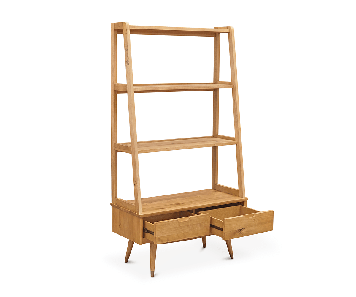 True Scandinavian character shines in the Bolig large leaning bookcase. Clean lines, angled perfectly form the shelves of graduating depths, while two drawers layer in convenient storage. Supported by graceful, tapered legs, this functional piece is crafted from solid American poplar with a distressed finish. The rustic reclaimed look of this collection is achieved through an intentional distressing technique that applies burn and saw marks to the surface while retaining and highlighting natural characteristics in the wood. This technique results in a reclaimed driftwood appearance, which adds personality and a one-of-a-kind uniqueness to each piece.