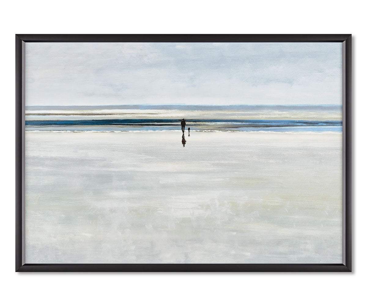 You can almost hear the waves lapping at the shore in the Contented Horizon Landscape wall art. Strolling with a canine companion brings joy and a sense of peace as you breathe in the fresh salt air. The neutral color palette is easy on the eyes and complementary to many styles of decor. Hang the light-filled canvas in any room in your home and watch it pop in the sleek black frame.