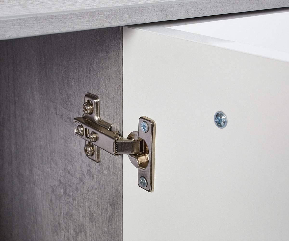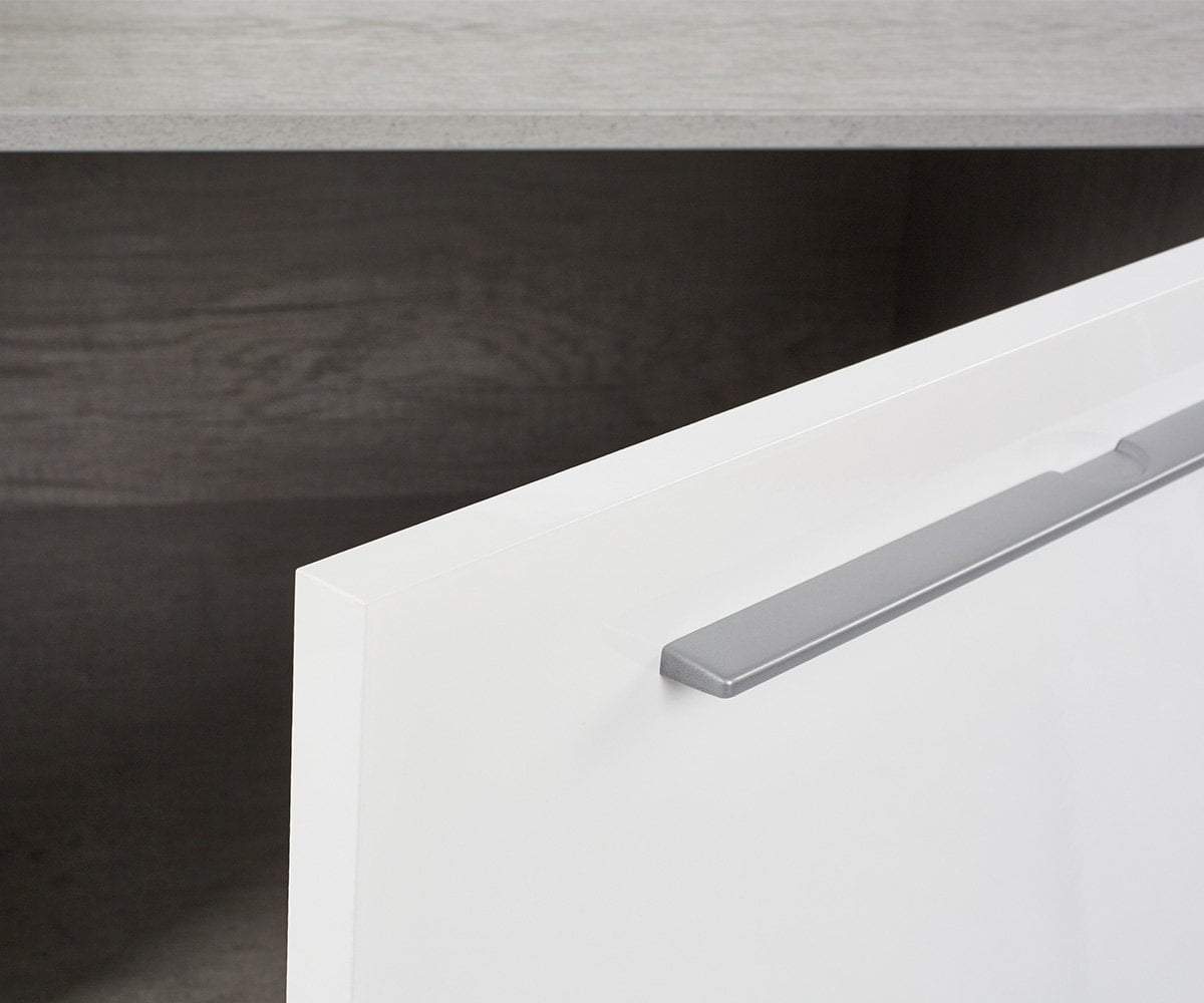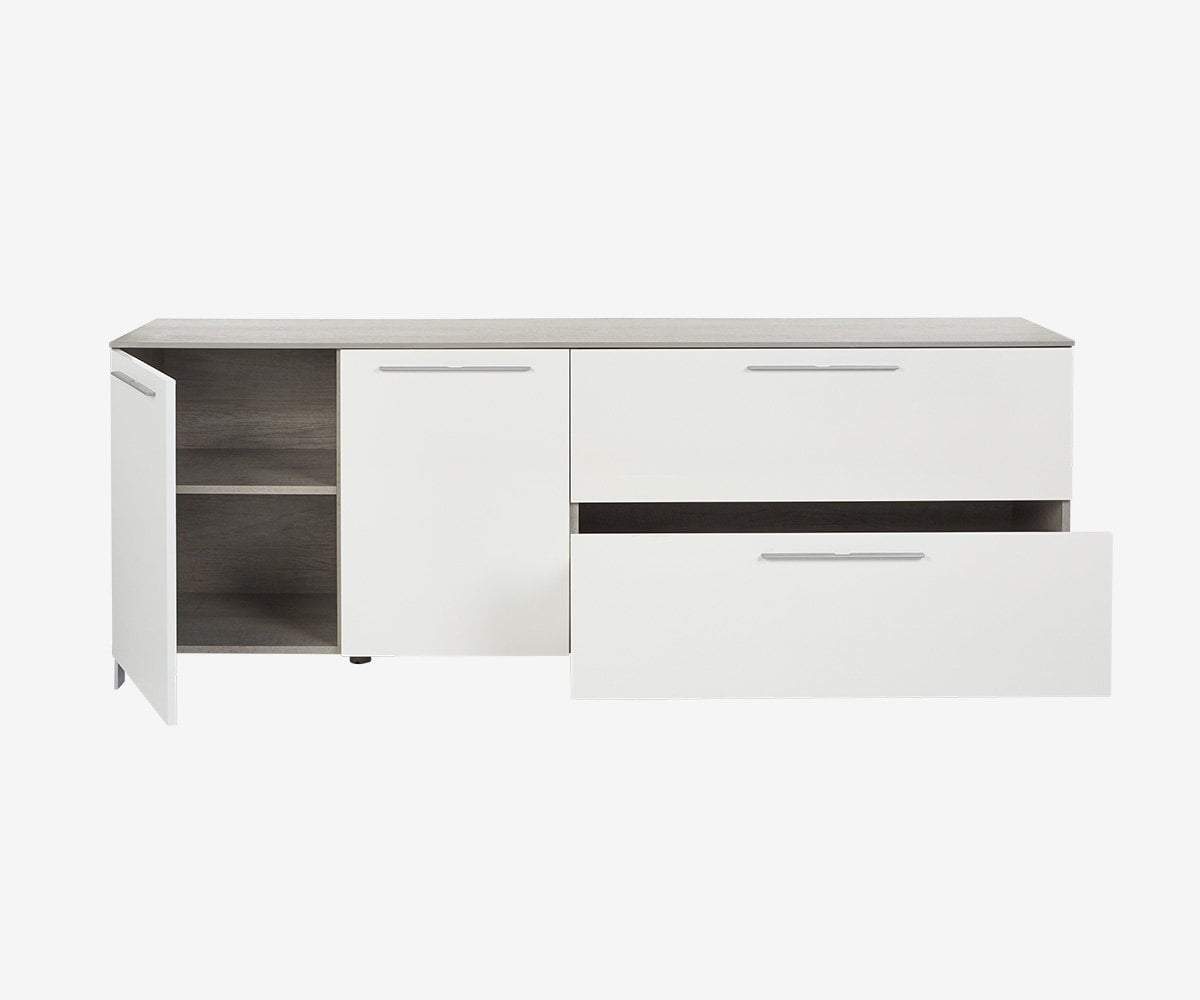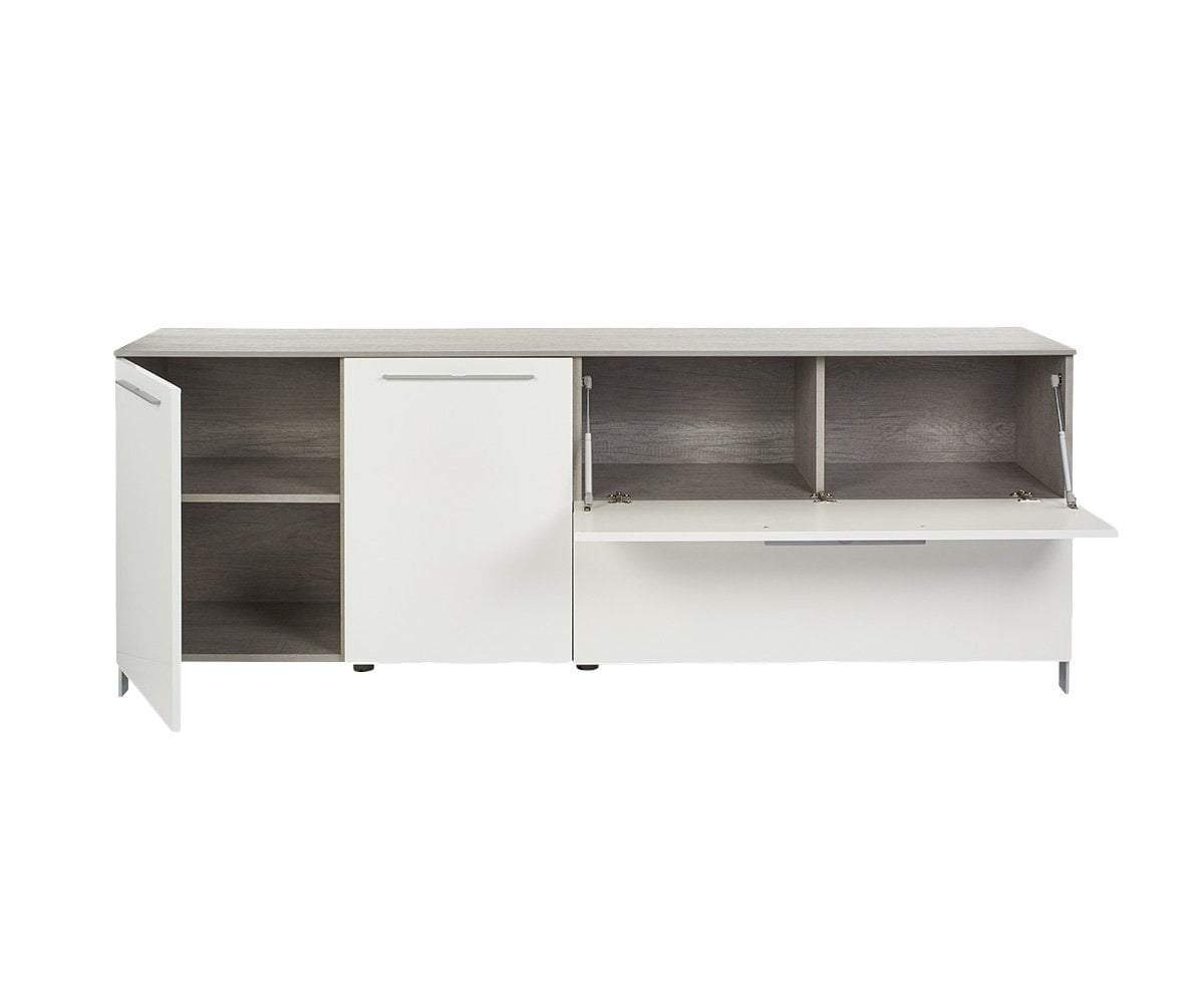 When you choose the Danne 82” media unit, you bring mod design and abundant storage to your living area. Crafted in Italy, this distinctive piece features two doors that open to reveal notable cabinet space, a cubby hidden behind the unique drop-down door and one large, deep drawer. The intriguing cement-look melamine of the body is complemented handsomely by the white facade in a sleek, high gloss finish. Metal legs and handles provide the finishing touch.