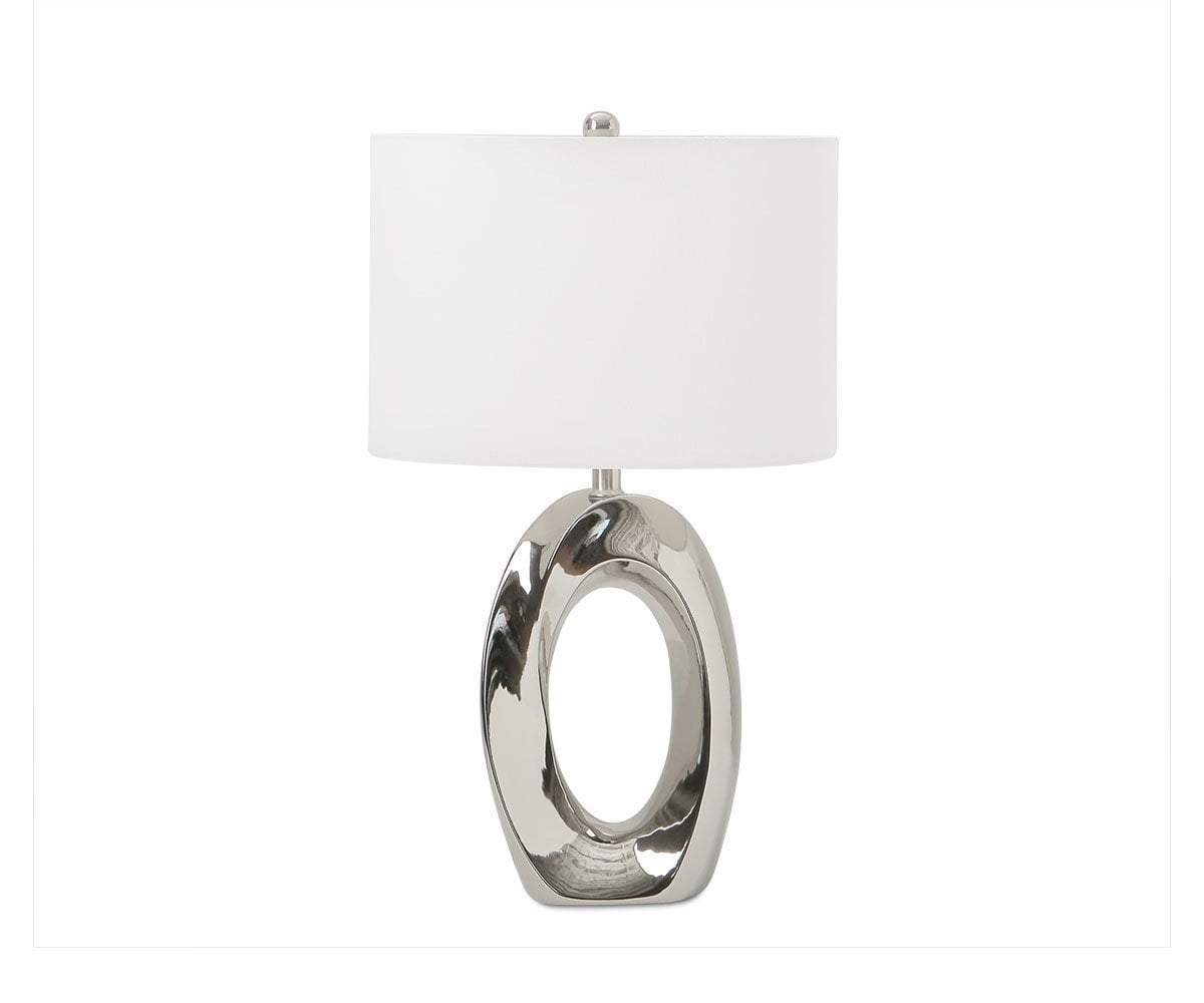 The ceramic base of the Darlene table lamp takes on the form of a mesmerizing modern art sculpture. Its oval shape reveals an interesting twist emphasized by the reflective high-shine finish. Completed with a crisp white fabric shade, this piece does more than illuminate a space, it adds bold, contemporary style to your decor.