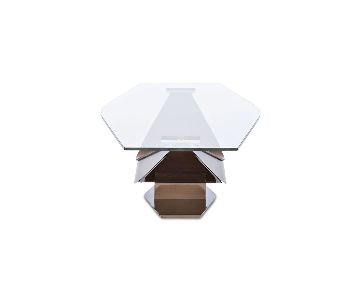 Vying to be the center of the room, the Dermae coffee table commands attention. Features a gracefully arched base crafted from brushed stainless steel with a walnut inlay supporting a shaped glass top.