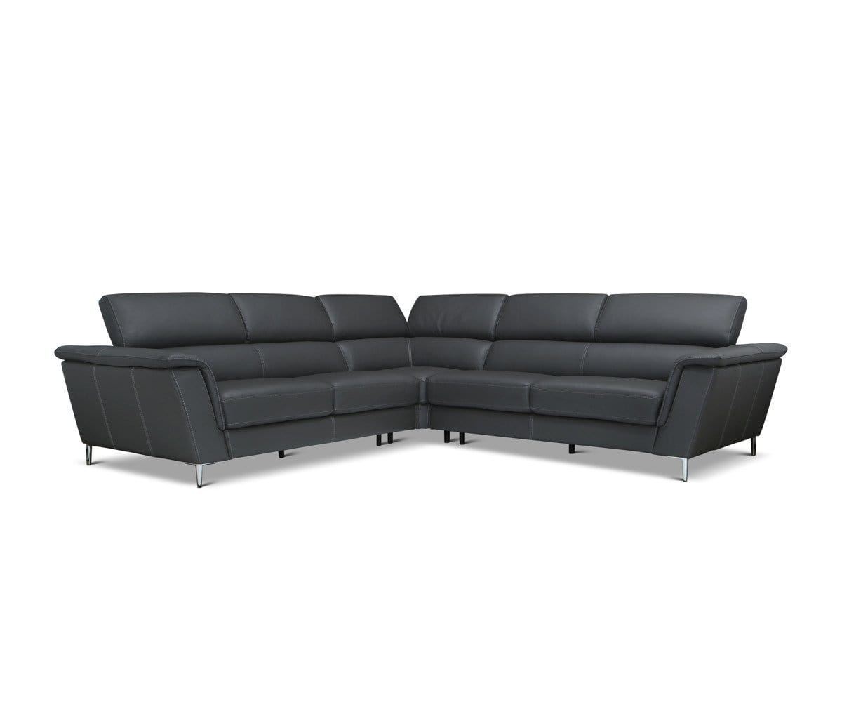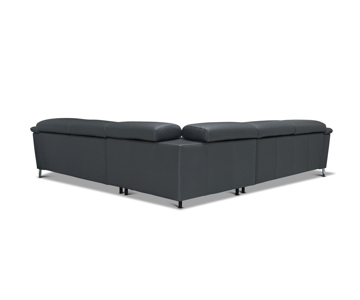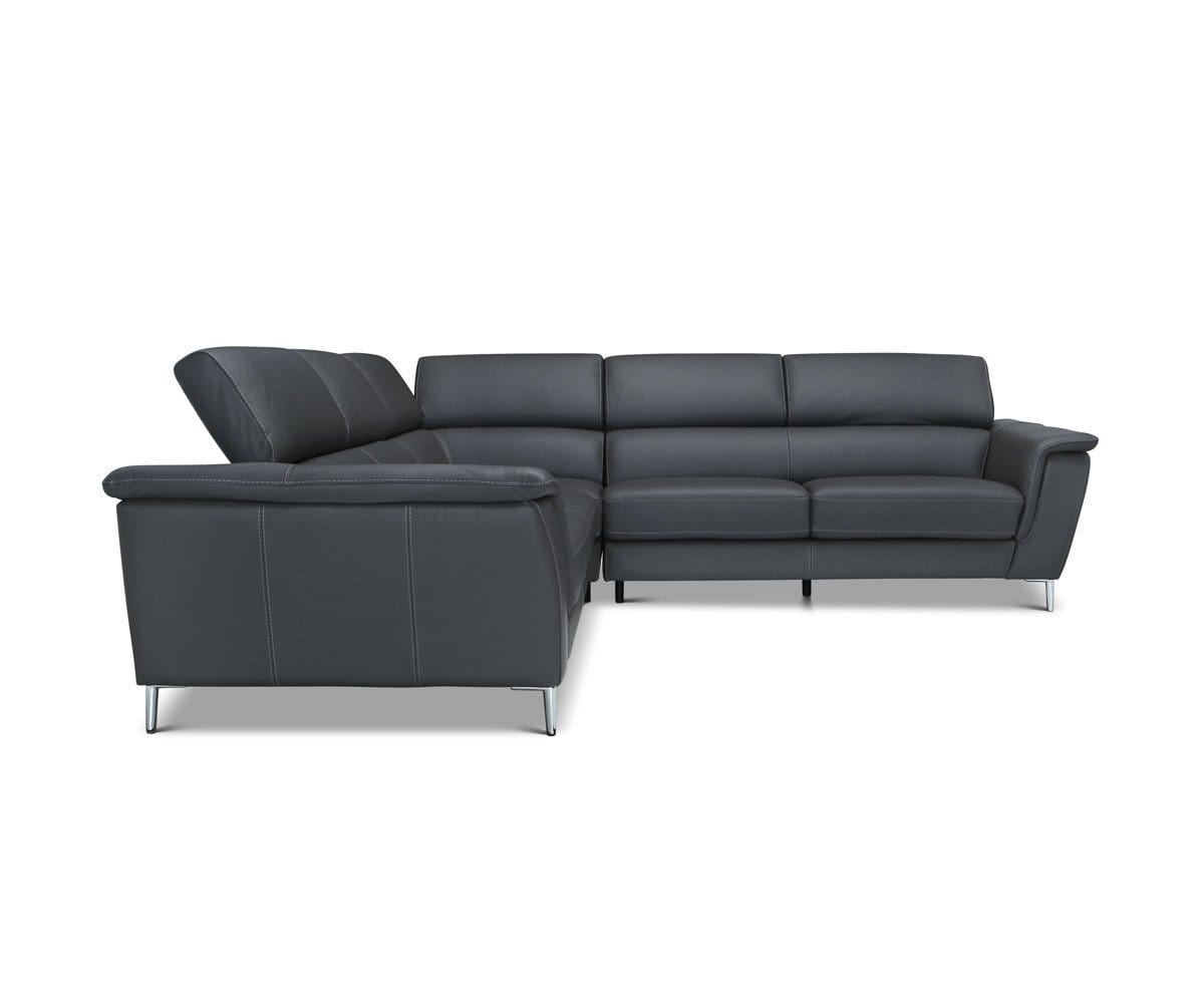 The Donte leather corner sectional offers modern style with modern comforts. Made in Italy with quality craftsmanship, it features dark grey leather upholstery and chromed metal legs to elevate the low profile. Plush cushions with elastic webbing throughout encourage you and your family to settle in and relax. Flip the ratchet headrests up for tv viewing mode or down for a more conversational feel.