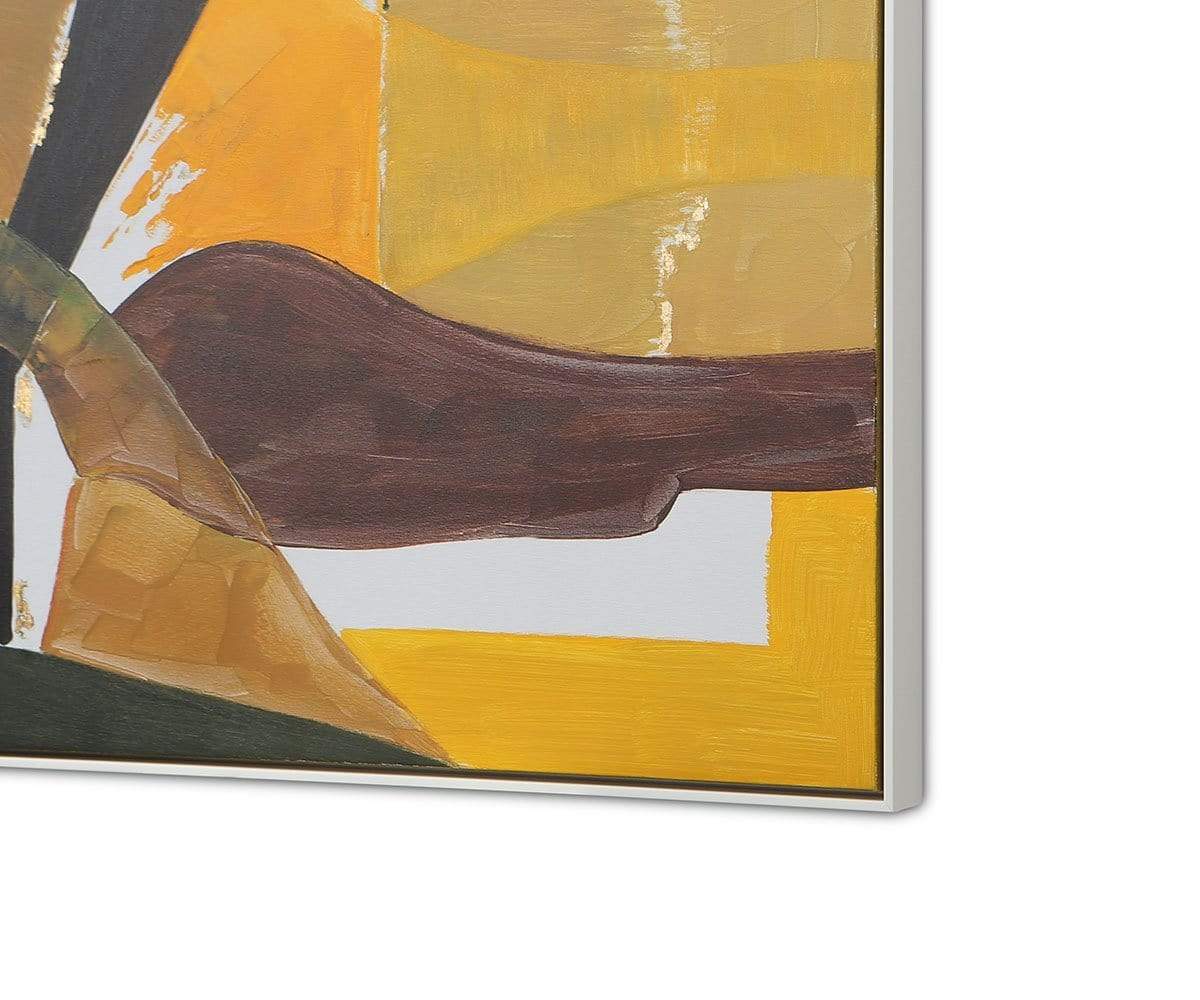 Bring rich, warm hues into your home with the Earthen Array Oil Painting. Layers of yellow and brown tones combine for an abstract scene. This art piece is complete with a white frame.